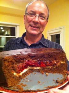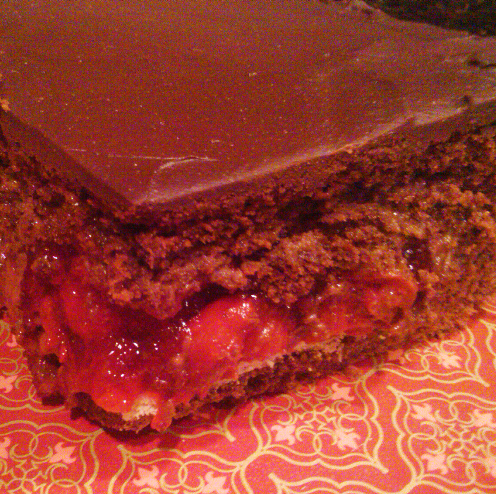 I had a small gathering of friends eager to see the result and it turned out quite well. I actually had pie-parazzi snapping photos and videos of the cutting of the cake. Kinda felt like I was at my wedding again:) The entire thing was dense but had a good flavor and the chocolate/cherry mix really was the bomb. I have some left over if you want to stop by and try it:)