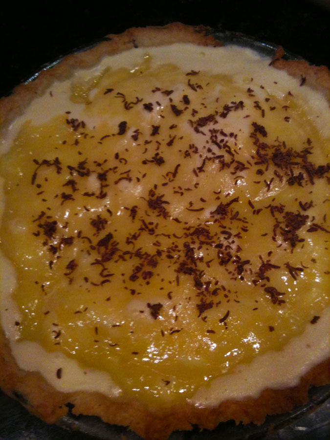 This is a non-bake pie, but I did a sweet crust from scratch, courtesy of the 500 Pies and Tarts cookbook. It didn’t come out that great and I’m not sure why. I mean, the crust doesn’t look great but I’m sure it’ll taste really good. The edges retreated a bit and the fluting, that looked so wonderful in dough (thanks Claudius Rex!), ended up disappearing. The filling is from a recipe at cooks.com. The original recipe is actually called Black Bottom Lemon Curd Pie, but I can never find chocolate nilla wafers. So I did my own crust and changed the name of the pie. Plus I used a glass pie dish and when the pie is frozen it actually has a foggy bottom. Is that bad?