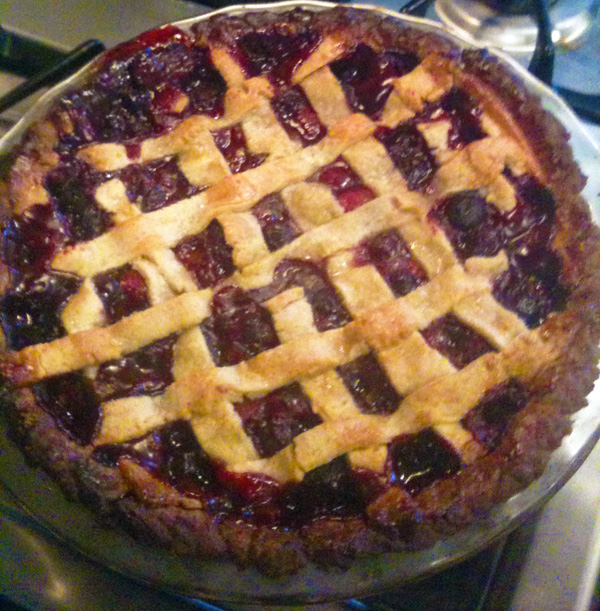 We went to friends for the 4th and had dinner and made our own fireworks show in their front yard. Dinner consisted of hamburgers, potato salad, beer or margaritas, and a bit of pie. Not necessarily in that order. This recipe was pulled from Epicurious circa 1997.  You don’t need a national holiday to make or eat this one. But it is certainly worthy of baking for such a day.